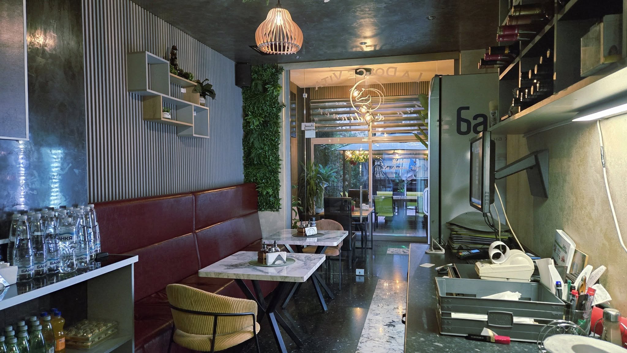 Стилната и уютна вътрешна част на ресторанта разполага с 60 седящи места. Интериорът е елегантен, с внимание към детайла, подходящ както за ежедневни посещения, така и за по-официални поводи. Пространството е климатизирано и отопляемо, което го прави перфектен избор през всеки сезон.